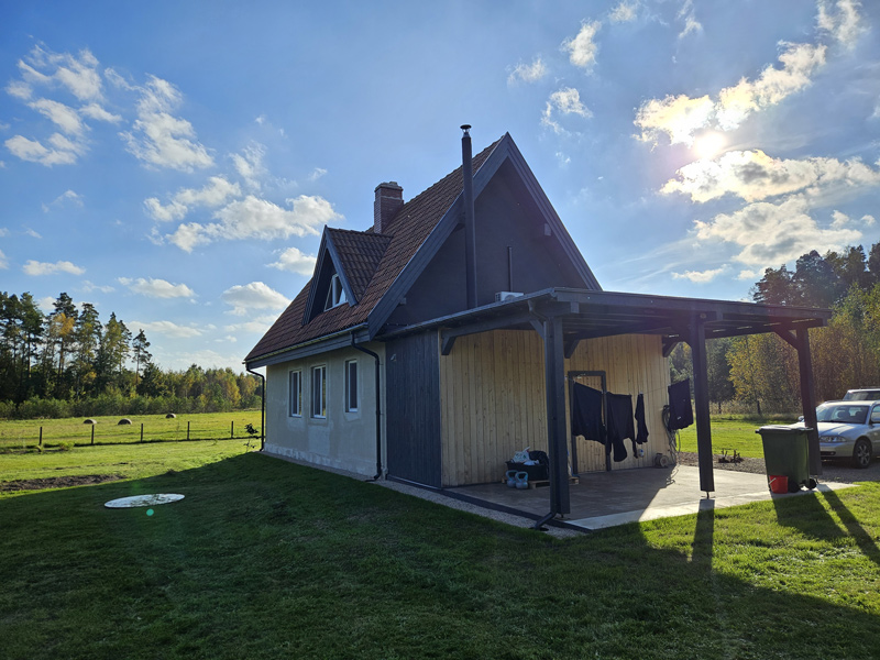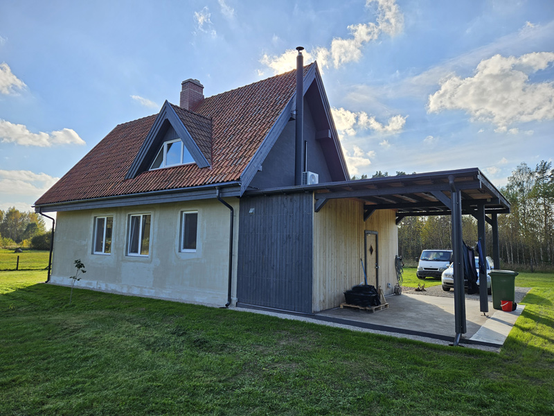 Jaunumi 2025. gada rudenī – dzīvojamā māja uzbūvēta, un jāveic ekspluatācijā nodošanas procedūra, attiecīgi, ir arī būvniecības gaitā dažas jaunas izmaiņas, idejas radušās, kuras redzamas attēlos – plānos, fasādēs un uzbūvētās ēkas fotoattēlos: