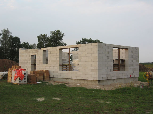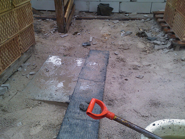 Attēlā redzams pamats nesošajai starpsienai un pamats skurstenim. Grīdas betonēšana tiks veikta pēc tam kad būs pabeigts jumts – šādi organizējot darbus lietus ūdens nesakrājas un nerada traucējumumus, bet tieši otrādi – ir noderīgs – palīdz skalot un blietēt piebērtās smiltis visu laiku līdz jumta uzklāšanai, tādēļ par iespējamo ēkas grīdas sēšanos ar katru lietaino dienu jāuztraucas aizvien mazāk.