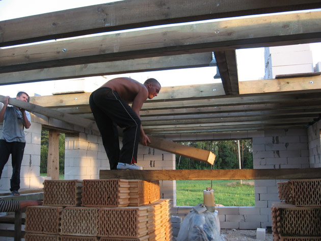 Turpinājumā bildes no mājas būvniecības procesa: