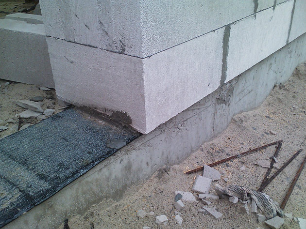 Pamati ir lentveida armēta monolītbetona lējums, 30 cm platumā, uz pamatu virsmas hidroizolācija – 2 kārtas ruberoīda ar bitumena mastiku. Virs tā uz cementa javas (lai izlīdzinātu) tiek mūrēta pirmā gāzbetona bloku rinda, ko panāk ideāli taisnu. Tālāk jau pārējās rindas mūrēt ir vieglāk, jo pirmo rindu var ņemt par atskaiti.