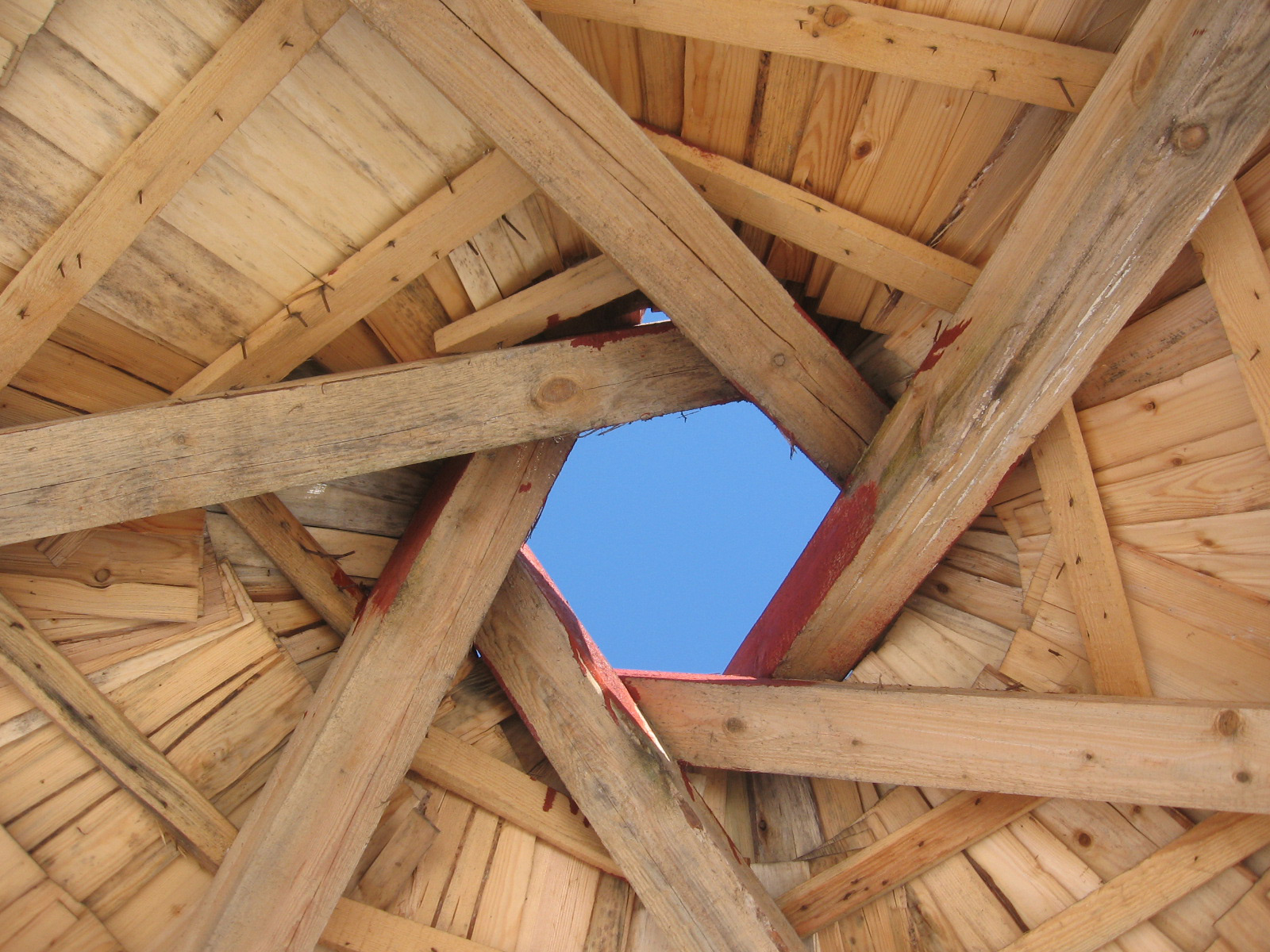 Šī bij senāk iesākta lapene – ar 6 vertikāliem stabiem un “mūrlatu”, kas vairākus gadus kalpoja kā rotonda. Līdz vienu dienu rudenī, atbrauca ciemos kolēģis, arhitektūras students, un daudz runāja par koka konstrukcijām, bija paņēmis līdzi grāmatu, un vispār bija ļoti aizrāvies ar to lietu. Tā nu apspriedām visādus risinājumus, un izdomājām ka jāaizbrauc uz gateri pēc 10x10cm brusēm, lai var uztaisīt tādu īpatnējas konstrukcijas jumtu lapenei. Bruses šādi sakrāmējot veido pārsegumu, ļoti stabili saāķējas savā starpā. Vēlāk tika uznaglots koka skaidu jumts, soliņi, šūpoļsols, lapenei vidū šamota puķupods ugunskura kuršanai, dūmi izplūst pa atveri jumtā.