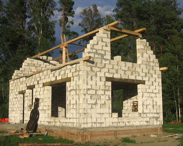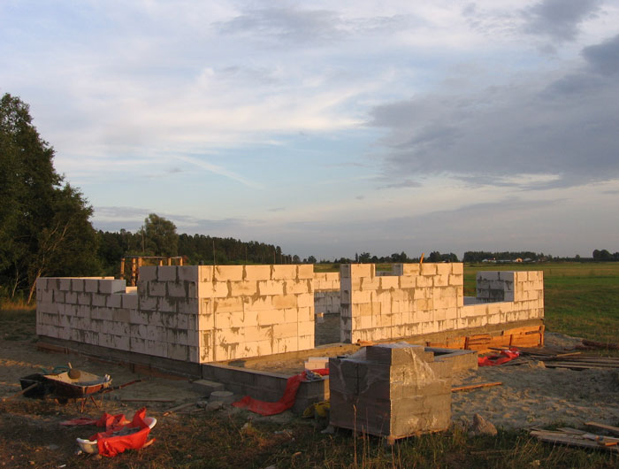 Pirmā gāzbetona bloku rinda top lēnām, jo šajā procesā tiek izlīdzinātas pamatu neprecizitātes, zem blokiem ir dažāda biezuma java. Starp pamatiem un pirmo rindu, protams, ir hidroizolācijas slānis, 2kārtas ruberoīda ar bituma mastiku.