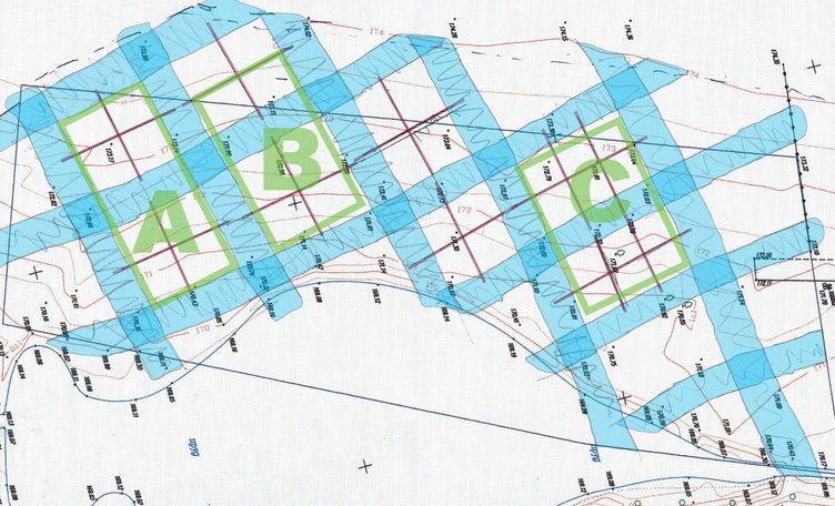Āderu pētijums veikts uz topogrāfiskā plāna, zemes īpašumu paredzēts palielināt, piepērkot vēl 18 metru platu joslu, jo īpašnieks vēlas uzbūvēt dzīvojamo māju un viesu māju. Ar A un B atzīmētas labākās vietas dzīvojamai mājai, ar C – viesu mājai: