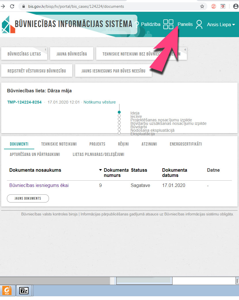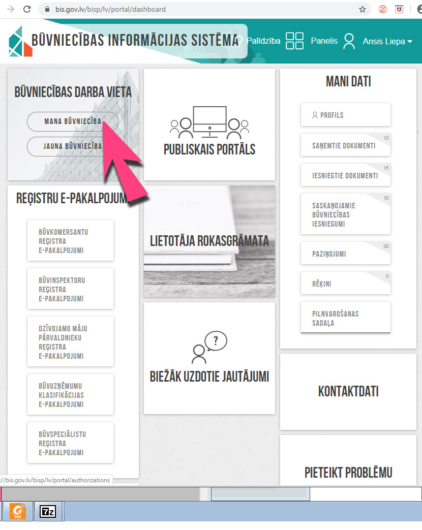 Atveras Jūsu lietotāja “Panelis”, intereses pēc, varat uzklikšķināt uz “MANA BŪVNIECĪBA”, lai aplūkotu savas būvniecības lietas: