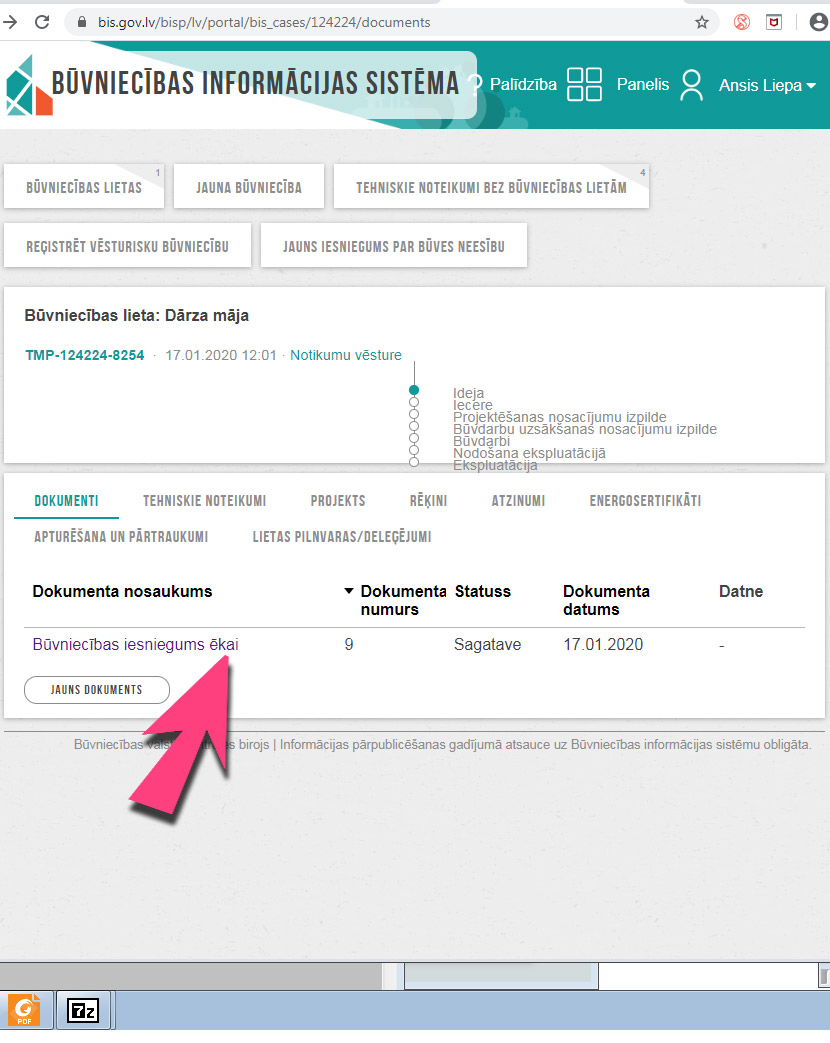Sāksim soli pa solim, lai pasūtītājam būtu pēc iespējas mazāk jāmaldās pa bis.gov.lv sistēmu, projektētājs jau iepriekš ir sagatavojis iesniegumu. Atverot bis.gov.lv mājaslapu – redzama šāda situācija, ar iespēju pieslēgties kontam, ko arī izmantojam (sekojiet sārtajai bultiņai):