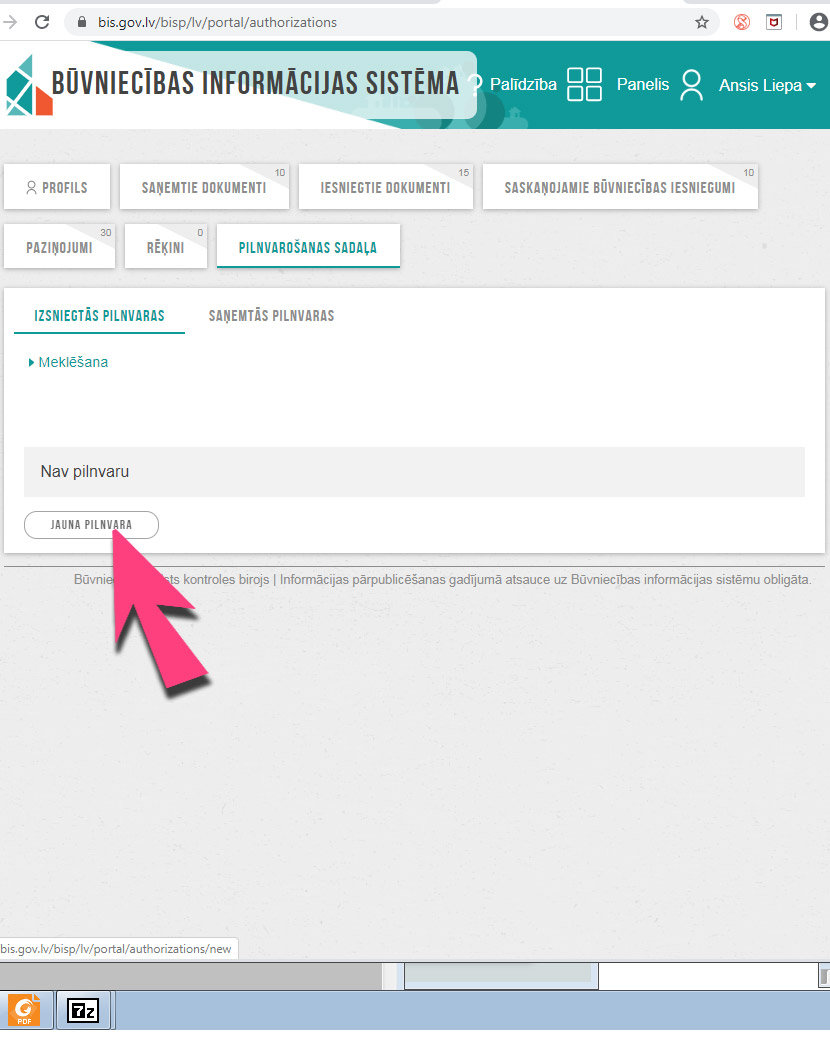 Pie būvniecības lietām būs sagatave, ko projektētājs būs izveidojis, ja interesē, varat to aplūkot sīkāk, bet, galvenais Jums veicamais uzdevums ir doties vēlreiz uz “PANELIS” – un sekojoši izvēlēties pilnvarošanas sadaļu: