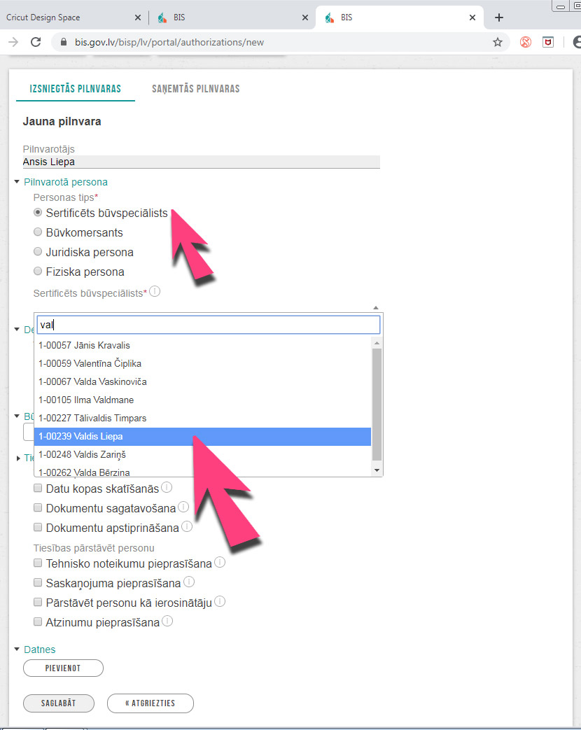 Pilnvarošanas sadaļā Jums jāizveido divas jaunas pilnvaras – 1. – sertificētam būvspeciālistam (arhitektam, kurš projektē Jūsu māju un/vai būvinženierim), un 2. – būvkomersantam (uzņēmumam, kurš veic Jūsu mājas projektēšanu), kā arī – ja nepieciešami projektētāji vēl papildus daļām, piemēram, ūdensvada un kanalizācijas sistēmām – izveidojiet jaunas pilnvaras arī šoiem uzņēmumiem un būvspeciālistiem, iepriekš ar tiem vienojoties.