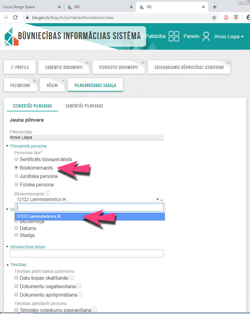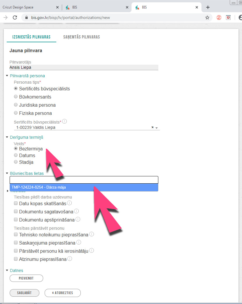 Un kad viena pilnvara jau pabeigta – ķeramies pie nākošās pilnvaras – būvkomersantam – uzņēmumam, Jūsu mājas projektēšanai, dokumentu gatavošanai, datu kopas skatīšanai utt. utjp.: