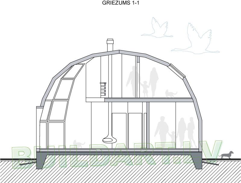Starp lielo daudzumu tradicionālo māju projektiem, laiku pa laikam ielavās arī kāds netipisks projekts – kā piemēram, šī dzīvojamā māja kupola formā. Projekts risināts divos stāvos, iegūstot vairākas atsevišķas guļamistabas, labierīcības katrā stāvā, skaistu kāpņu halli – balkonu virs pirmā stāva, un plašu dzīvojamo istabu ar augstiem griestiem un plašiem stiklojumiem. Ja no plānojuma un vizuālā izskata viedokļa – atbilstoši pasūtītāja vēlmēm viss ir iespējams diezgan brīvi, tad konstruktīvie risinājumi ir, zināmā mērā, projektētāja izaicinājums. Līdz šim esam projektējuši vairākas kupolmājas, dažādos konstruktīvos izpildījumos, gan būvētas no trijstūra segmentiem, gan šādas – veidotas no “apelsīna šķēļu” formas detaļām.