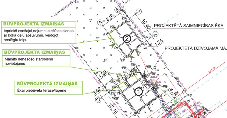 Pielikumā – ilustrācija ar ēkām veiktajām “lielajām” pārbūvēm, kuras senāk kadastra speciālists fiksēja ēku inventarizācijas lietā ievelkot ar sarkanu pildspalvu. Šodien šādu sīku papildinājumu saskaņošana sekojot birokrātiskajām prasībām var izmaksāt vairākus tūkstošus. Var sākt pat apdomāt variantu, vai vienkāršāk nav nojaukt uzbūvētās detaļas, kā saskaņot. Tajā pat laikā būvvaldes ziņo, ka būvprojektu saskaņošanas ilgumu tiek paredzēts samazināt par 40 dienām. Jāpiebilst, ka ēkas ir būvētas pirms apmēram 70 gadiem, un to īpašnieki ir pensionāri, kas saviem spēkiem šīs papildus detaļas ēkām piebūvējuši, kā ikdienā nepieciešamas lietas.